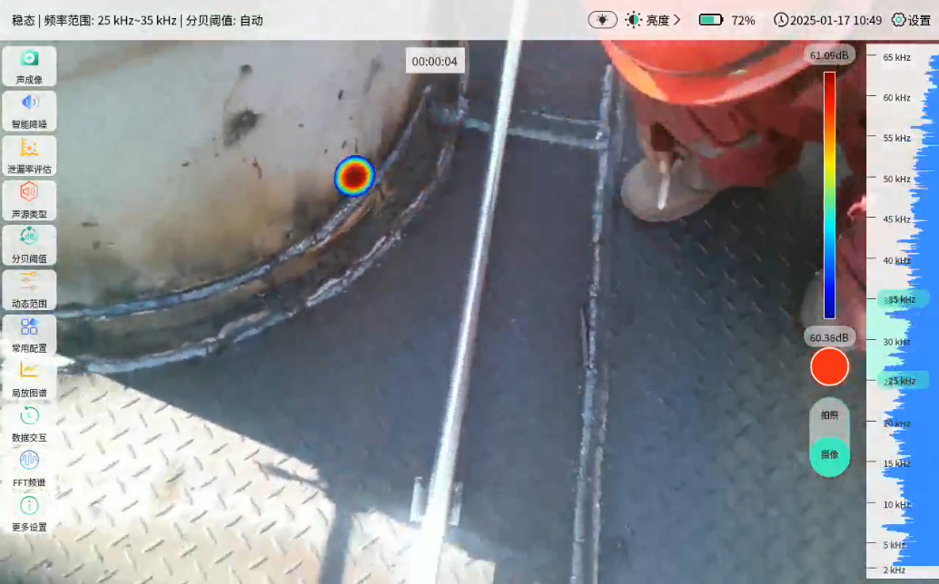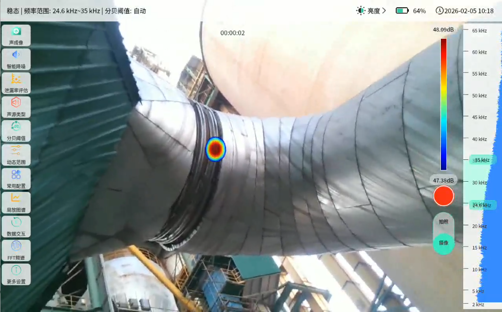 技术创新破解行业痛点,气体漏点可视定位仪以“可视化、远距离、高效率”的核心优势,成为环保改造检测神器。其首要优势是可视化定位,依托麦克风阵列波束形成技术获取声源分布数据,并配合高清摄像头实时采集视频画面,把变化的声源动态呈现在显示屏上。